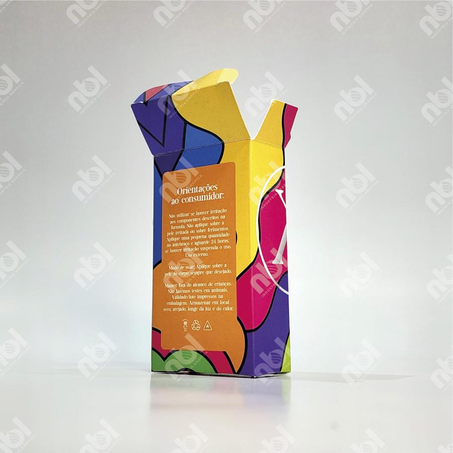 Caixa cartucho vertical para perfume 50ml, desenvolvida para acomodar o frasco com segurança e excelente apresentação. Produzida em papel cartão resistente, com fechamento em abas superiores e inferiores, garantindo firmeza e proteção no transporte