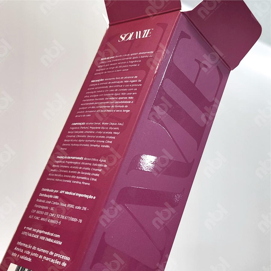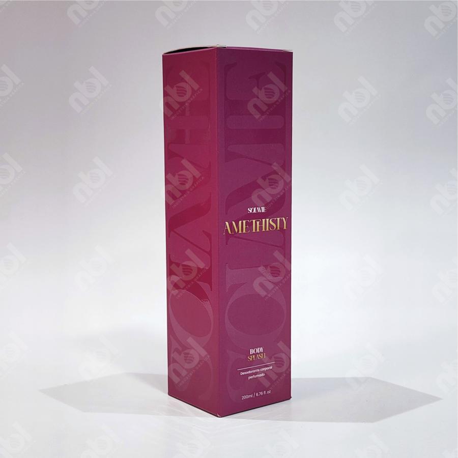 Caixa cartucho vertical para body splash 200ml, desenvolvida para acomodar frascos maiores com segurança e excelente apresentação. Produzida em papel cartão de maior gramatura, com fechamento em abas superiores e inferiores, garantindo resistência e