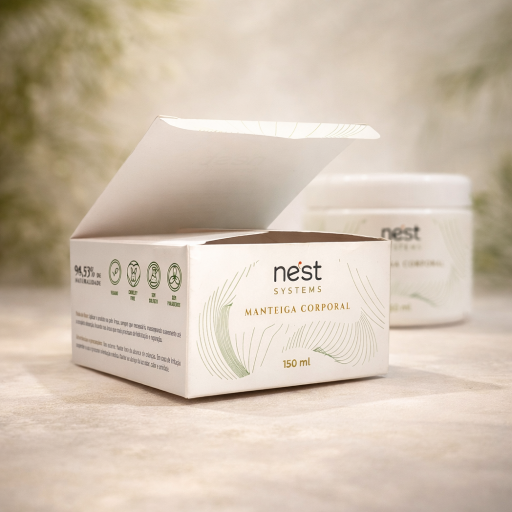 Caixa personalizada para pote 180g, projetada para envolver o produto com estrutura firme e encaixe preciso. Desenvolvida com papel cartão de alta qualidade e sistema de abas reforçadas, oferece proteção sem comprometer a estética. Ideal para linhas